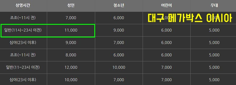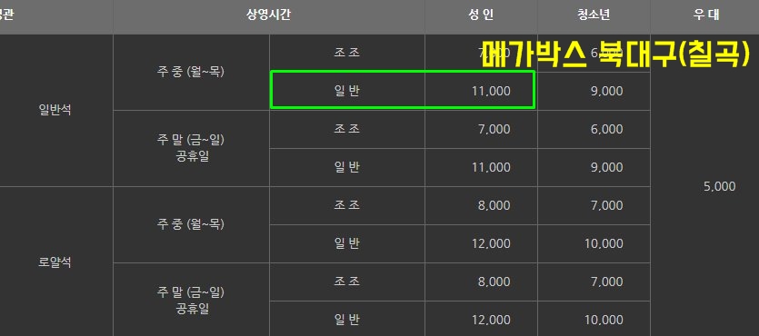 13시 이후의 기준으로 살펴보면 대구 메가박스 칠성로점이 오전 10시~23시 까지 10,000원의 요금으로 대구지역 메가박스 중에서는 가장 저렴합니다.