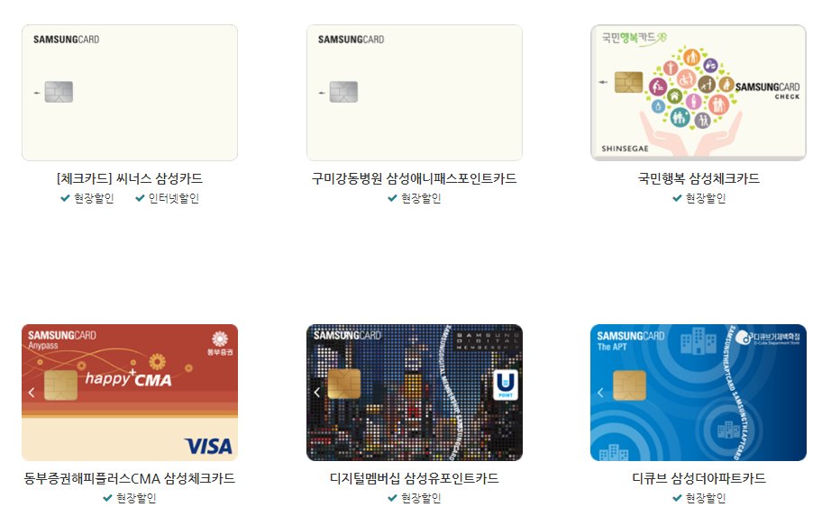 국민, 삼성, 하나, 우리, 체크카드까지 대부분의 제휴사들이 할인을 제공하고 있습니다. 단 카드마다 전월 사용실적에 따라 조금씩 다른 점들이 있으니 자신이 보유하고 있는 카드를 검색해서 확인해보시기 바랍니다.