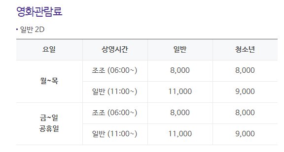 또한 주중 및 주말 영화 관람요금이 다른 점이 특징이라 할 수 있습니다.