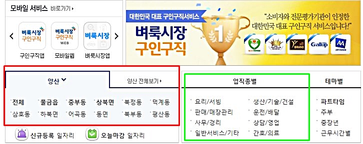 실제 벼룩시장 홈페이지를 보면 양산 지역뿐 아니라 인근지역의 취업정보도 제공이 되는 것을 확인할 수 있습니다.