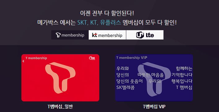 그만큼 영화요금도 무시할 수가 없는데요, 메가박스 할인 혜택을 살펴보면 통신사 할인뿐만 아니라 신용카드 할인 혜택 등 다양하게 있으니 홈페이지를 참고하시면 좋을 것 같습니다.