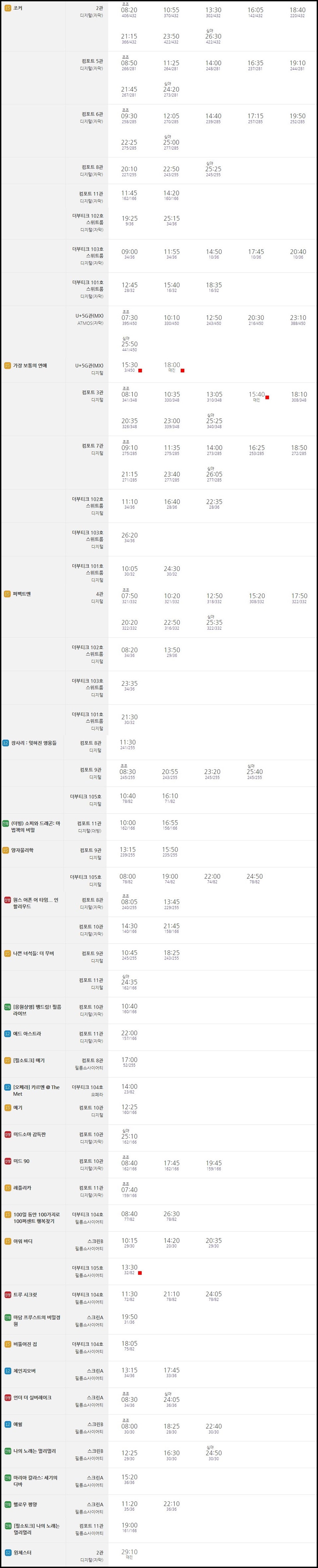 주말을 맞아 나들이하러 나온 많은 관객들이 대부분 이 두 영화를 관람할 것이라고 예상되는데요 그러한 덕분에 하루 상영 편도 가장 많이 있음을 알 수 있습니다.