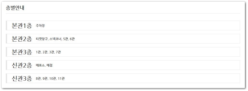 메가박스 충주점은 총 11관까지 있습니다. 층별 안내도를 참고하시고 즐거운 영화 관람하시기 바랍니다.