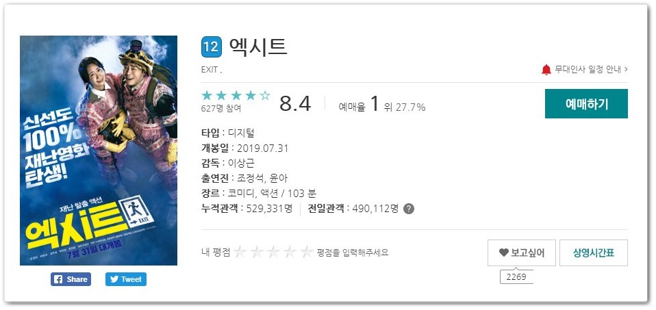 첫 번째 영화는 조정석, 윤아 주연의 엑시트입니다. 여름방학 극장가를 배꼽 빠지게 만드는 영화인 것 같습니다.