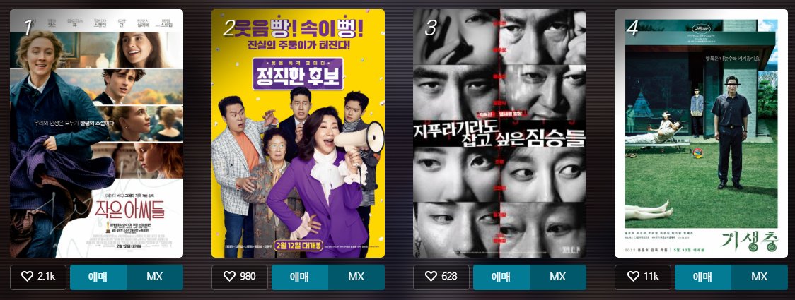 박스오피스에 나와있는 메가박스 예매순위를 살펴봤습니다. 현재 작은아씨들, 정직한 후보 등이 가장 많은 관심을 받고 있는 영화라 할 수 있습니다.