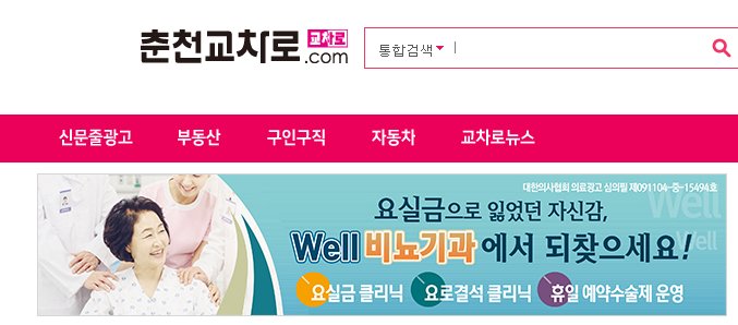 춘천 교차로 홈페이지에 들어가면 상단에 부동산, 구인구직, 자동차, 교차로 뉴스등의 카테고리가 있습니다.